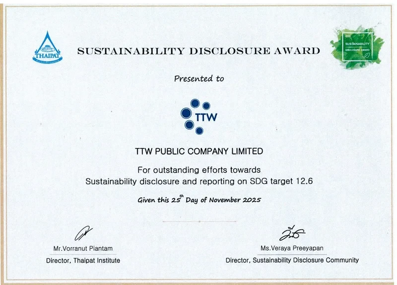 TTW Public Company Limited (TTW) received the prestigious “Sustainability Disclosure Award” for 2025, the seventh consecutive year, from the Thaipat Institute. This award recognizes organizations that disclose sustainability information beneficial to stakeholders. The award is based on an assessment of publicly disclosed operational information, such as TTW's sustainability report and webpage, which presents complete and reliable sustainability information in accordance with the Global Reporting Initiative (GRI) standards. The disclosure of sustainability information beneficial to stakeholders reflects the organization's role in sustainable development in all dimensions, including environmental, social, and governance (ESG), as well as organizational development towards sustainability.