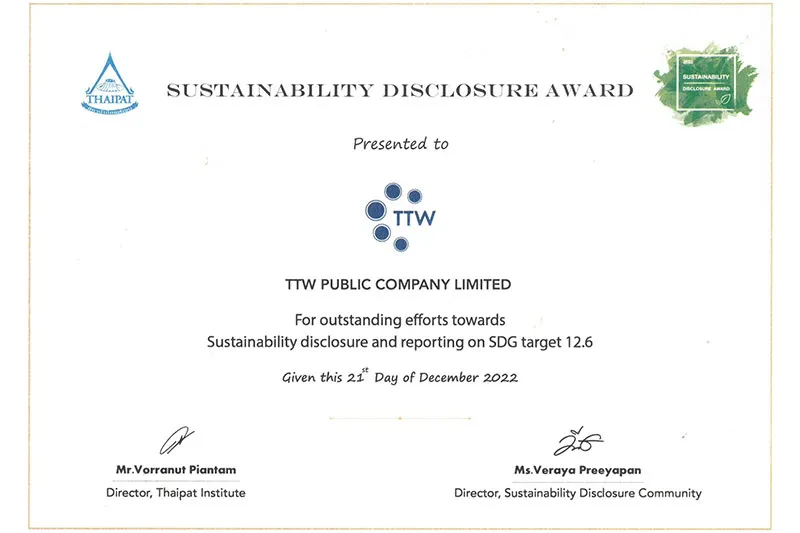 21 December 2022 - TTW Public Company Limited (TTW) received an honorary award. “Sustainability Disclosure Award” for the year 2022 for the 4th consecutive year from Thaipat Institute reflecting the development of the organization towards long-term sustainability.
