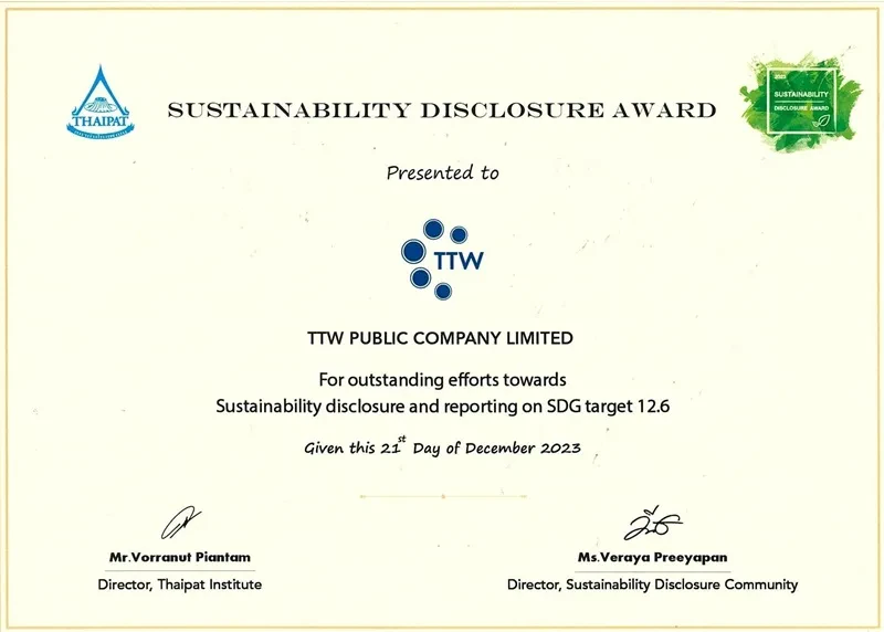 TTW Public Company Limited received the "Sustainability Disclosure Award 2023“ for the fifth consecutive year at the Sustainability Disclosure Award ceremony organized by Thaipat Institute. This recognition reflects the organization's continuous commitment and progress towards sustainability